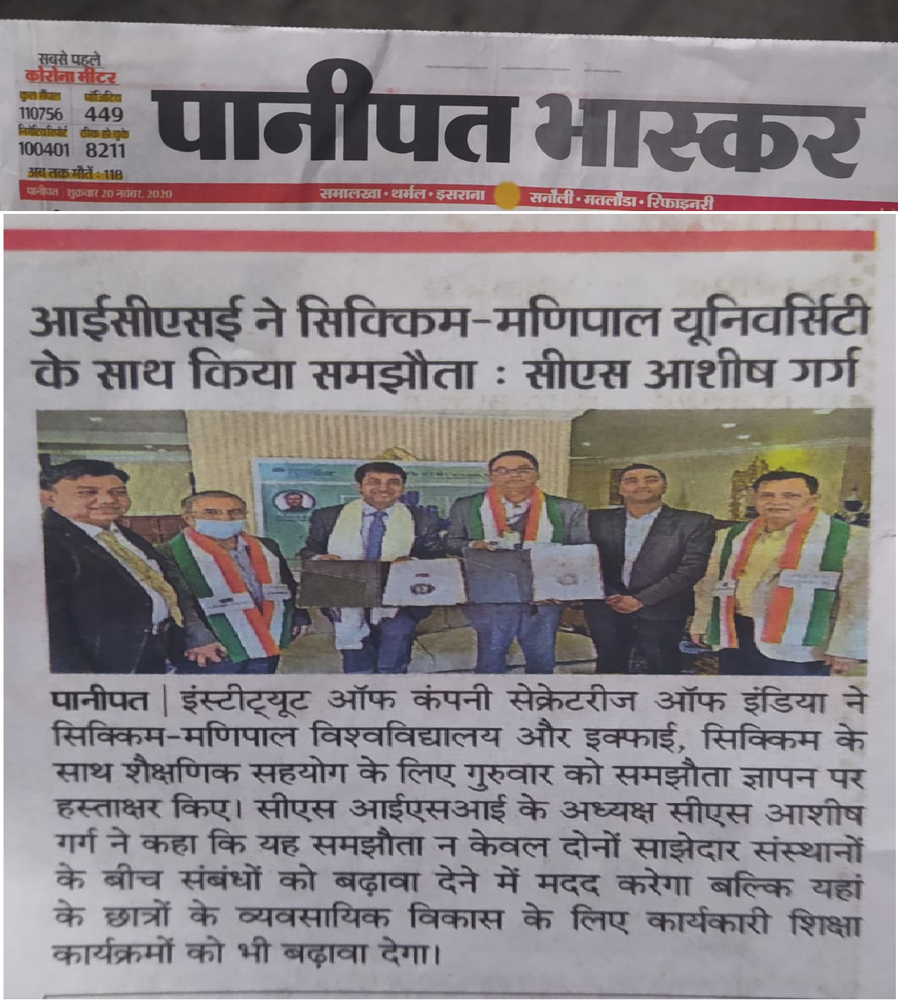 ICSI tied up with Sikkim-Manipal University - CS Ashish Garg ( President ICSI)
