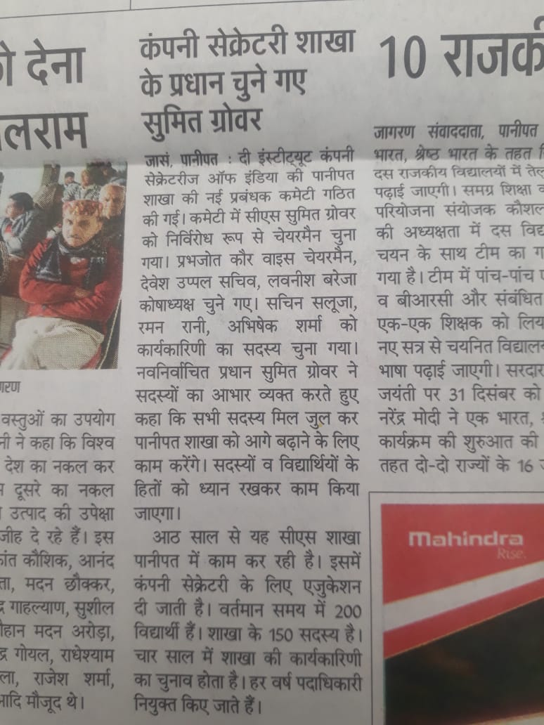 CS Sumit Grover elected as the chairman of panipat chapter for the year 2020.