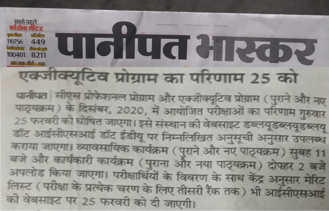 Declaration of result of CS Professional Programme & Executive Programme (Old and New Syllabus) on 25th February, 2021