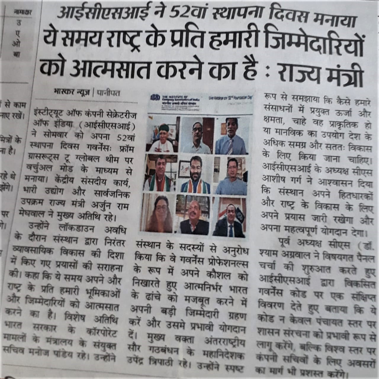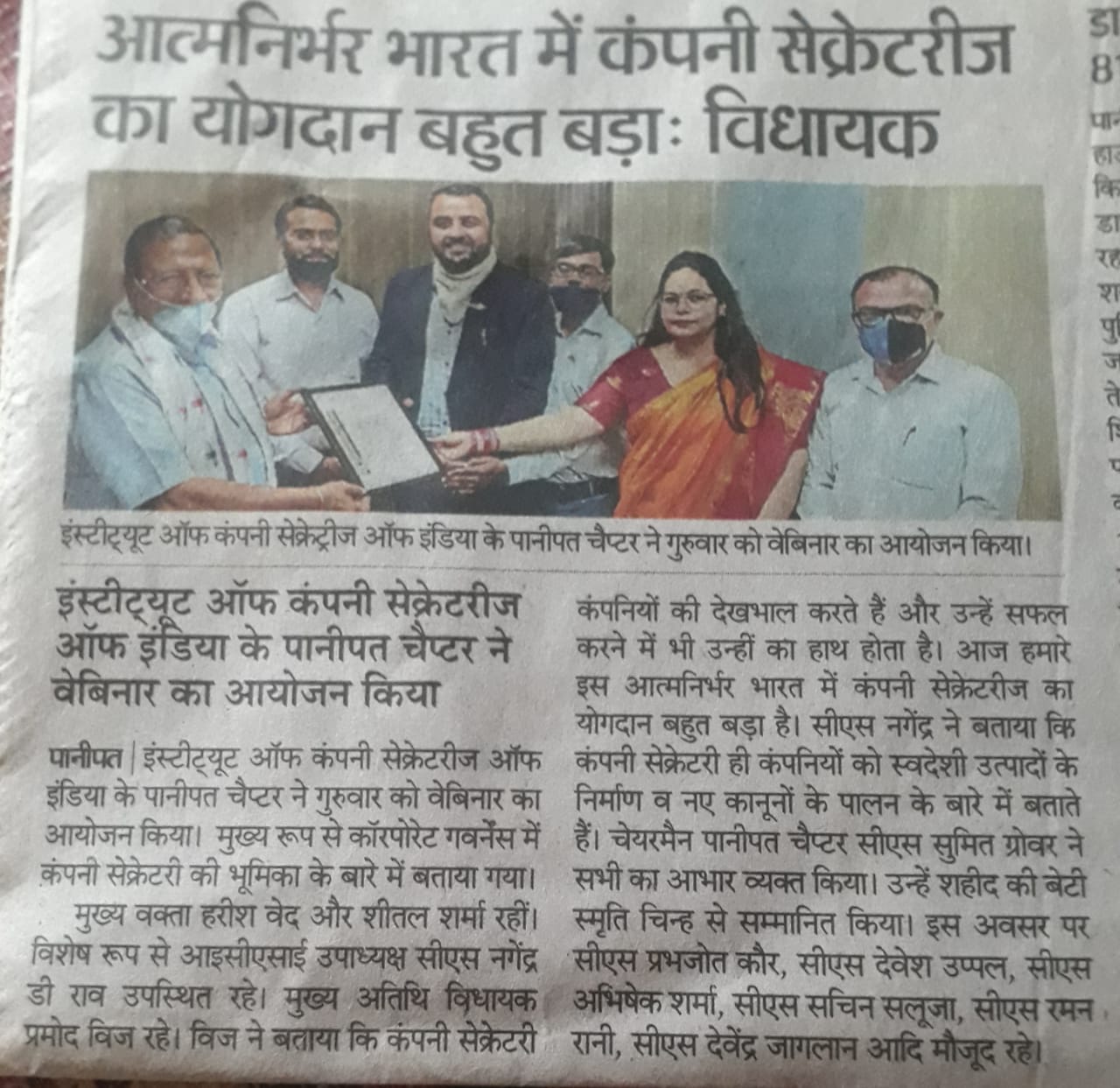 Sh. Pramod Vij ( MLA Panipat City) as a Chief guest in the Webinar of Panipat Chapter of ICSI on 20th July, 2020 and Felicitated with the "Shaheed Ki beti" by Committee Members.