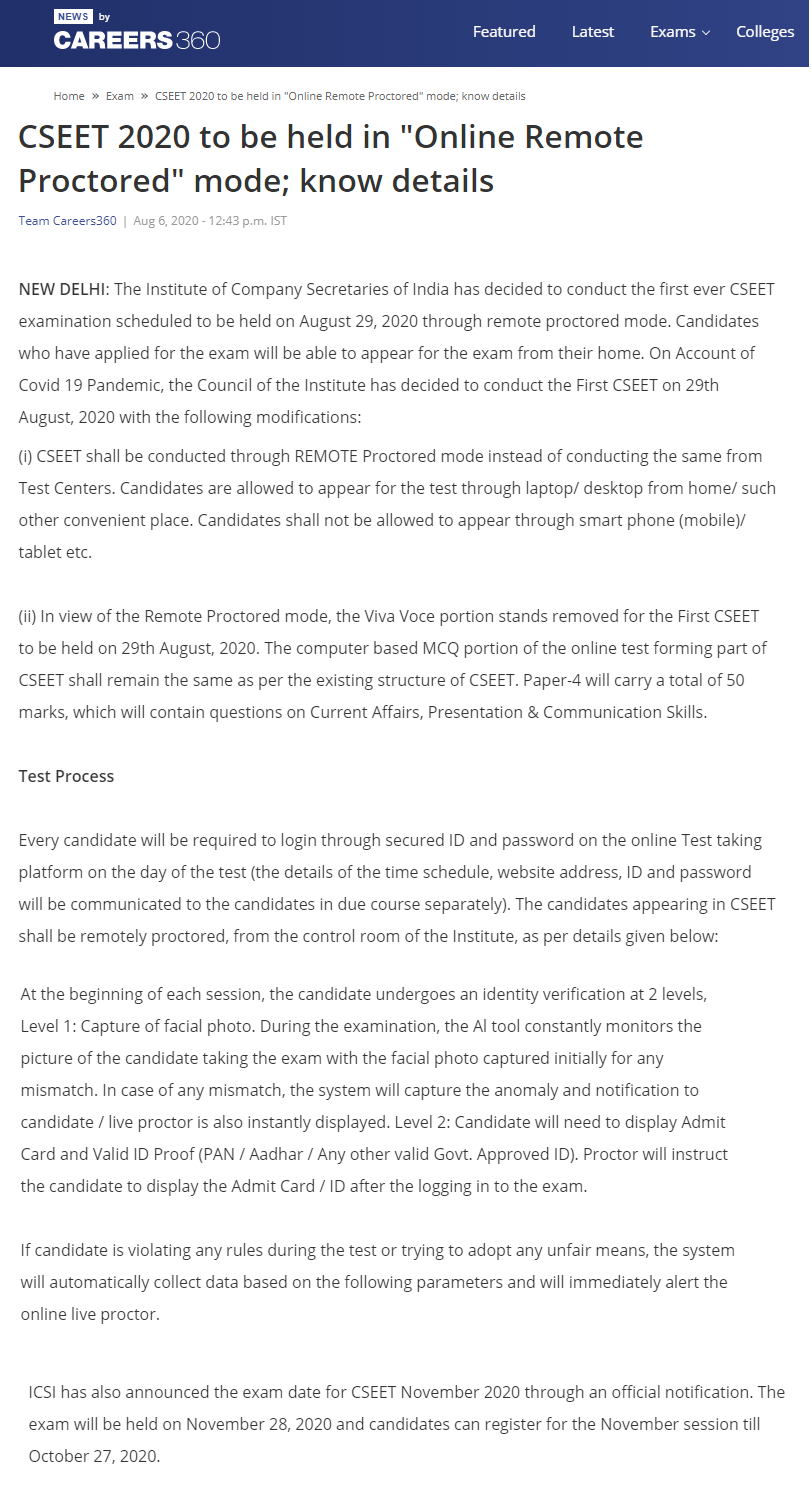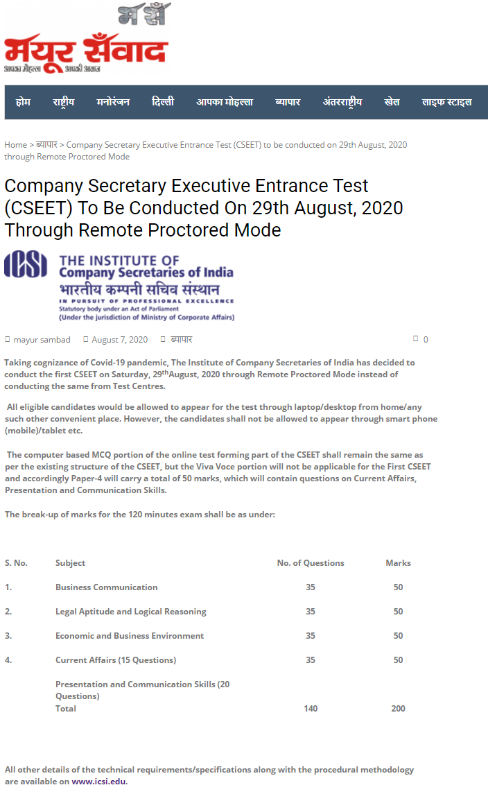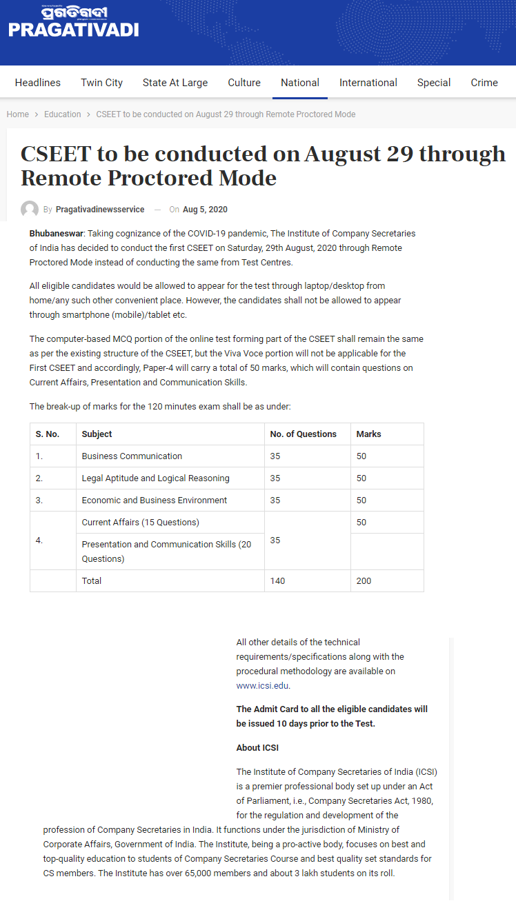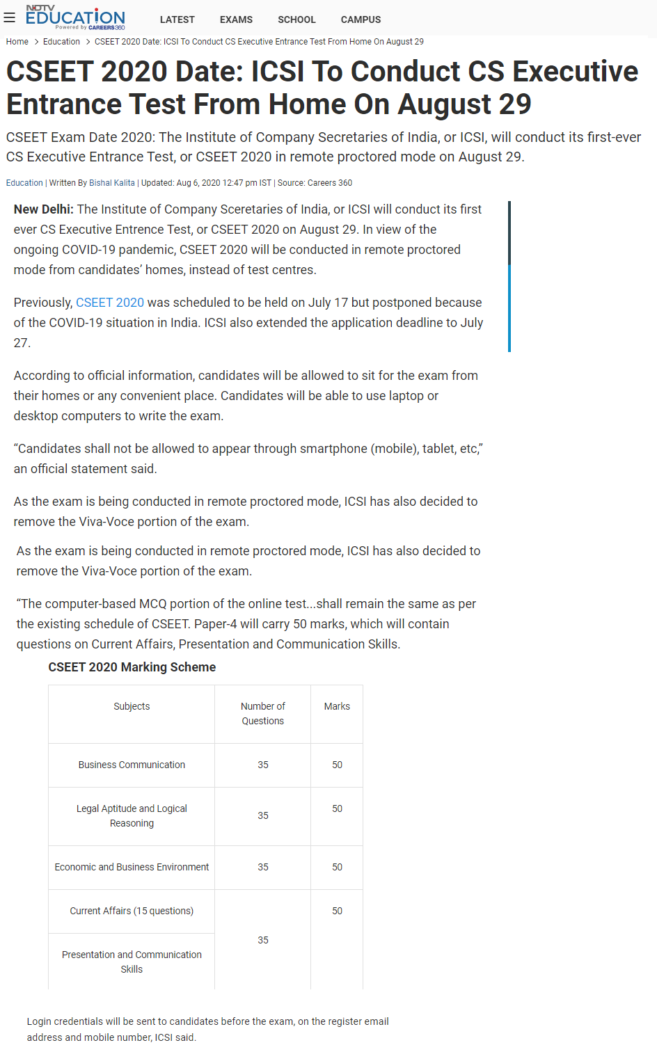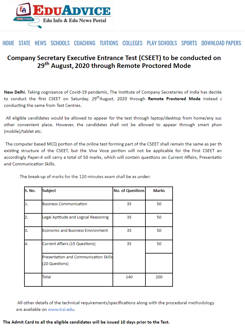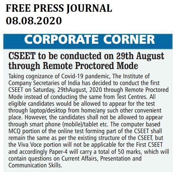 Company Secretary Executive Entrance Test (CSEET) to be conducted on 29th August, 2020 through Remote Proctored Mode
