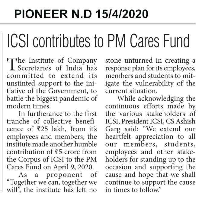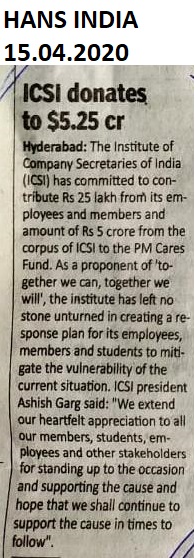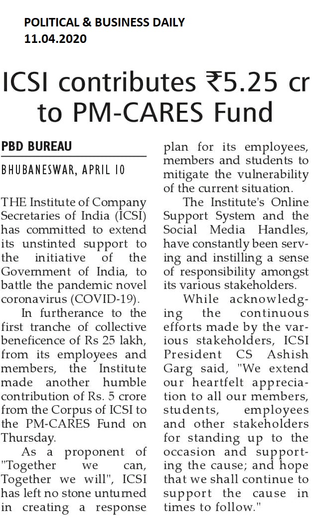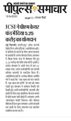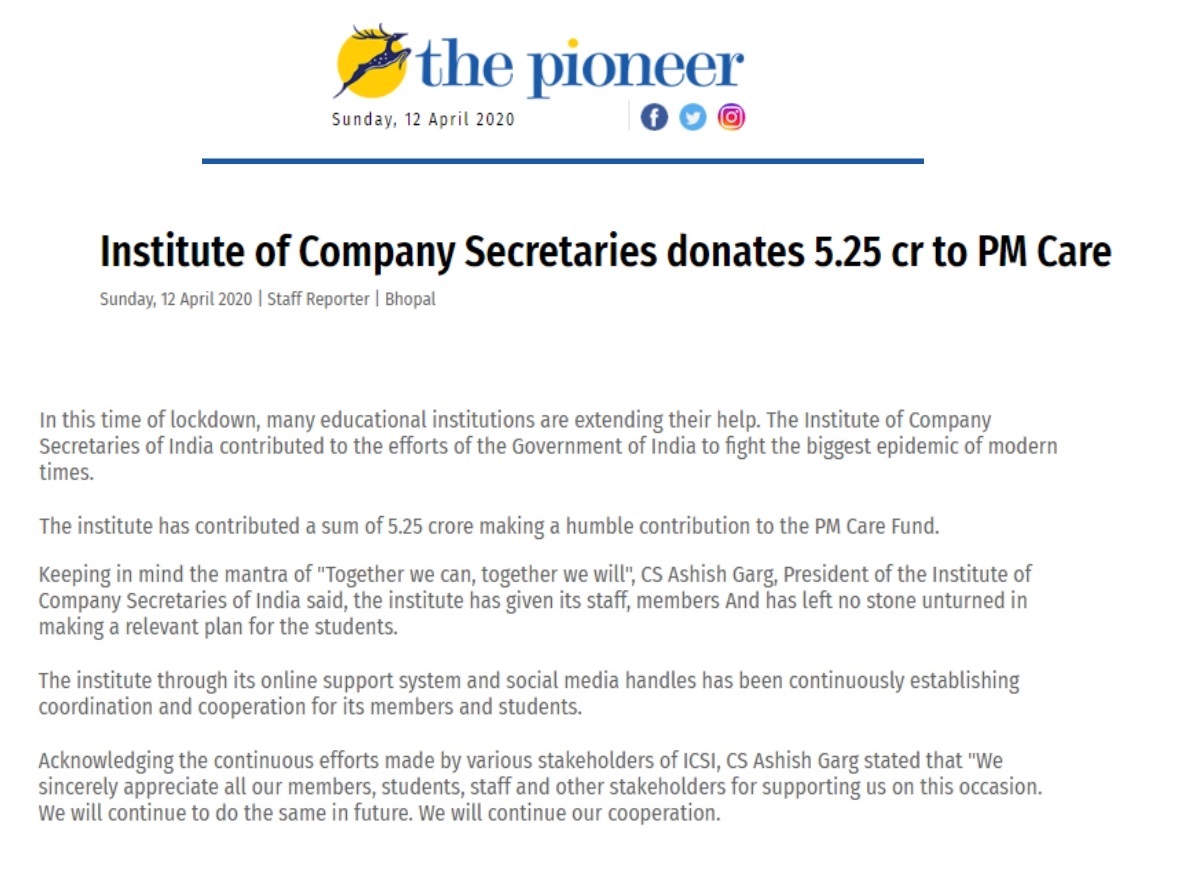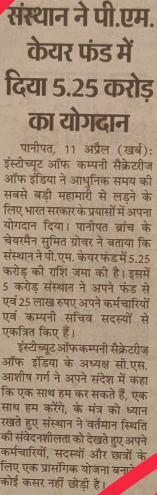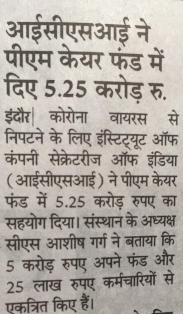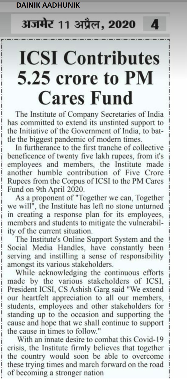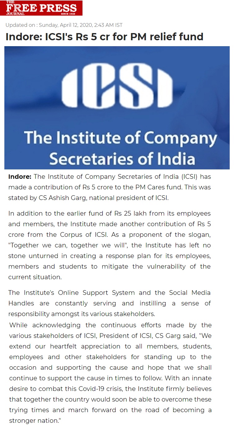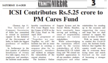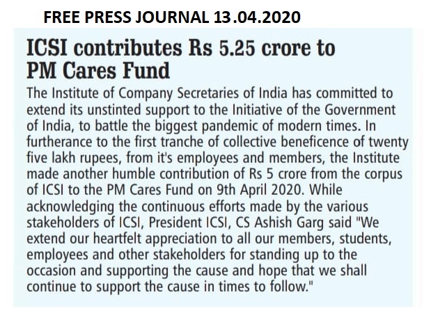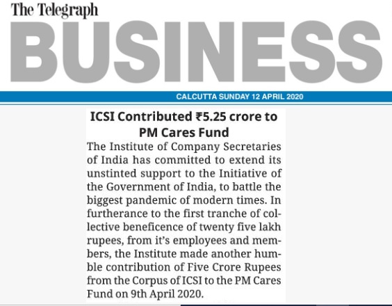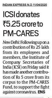 ICSI Contributes Rs.5.25 crore to PM Cares Fund