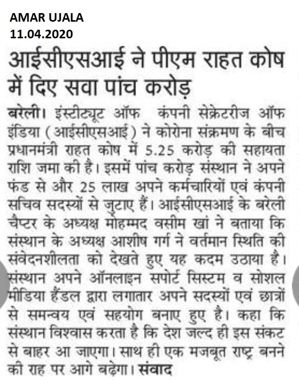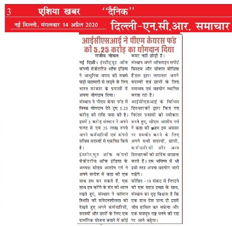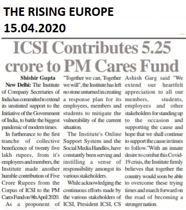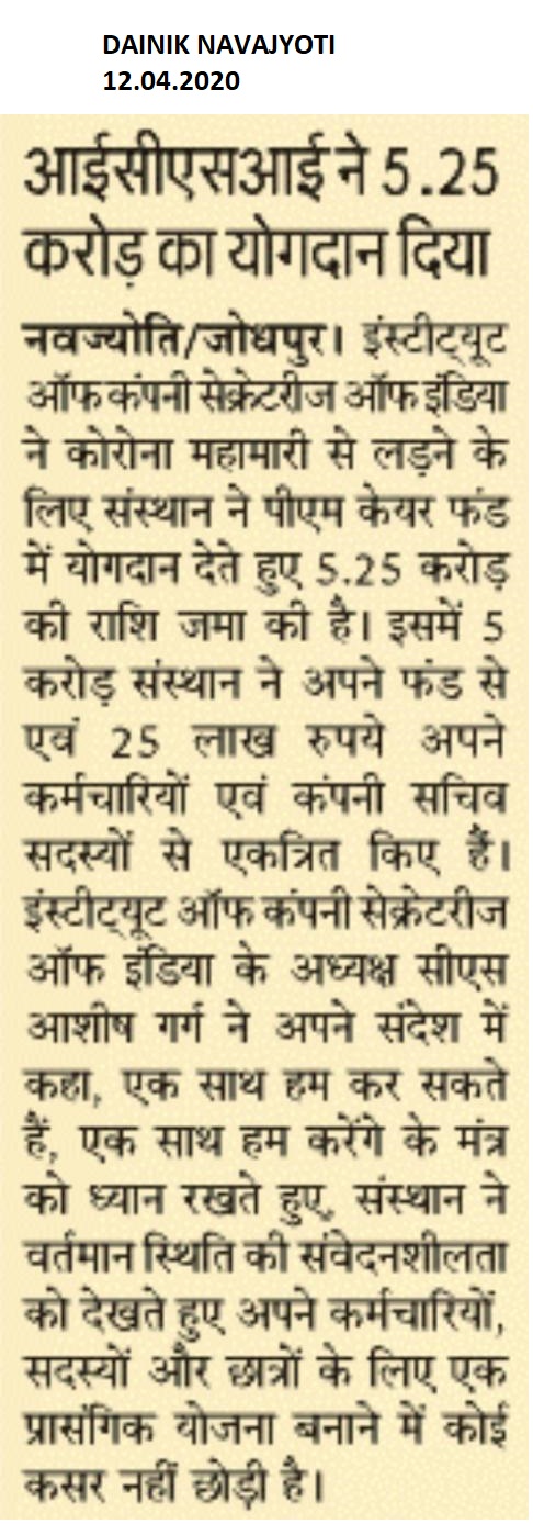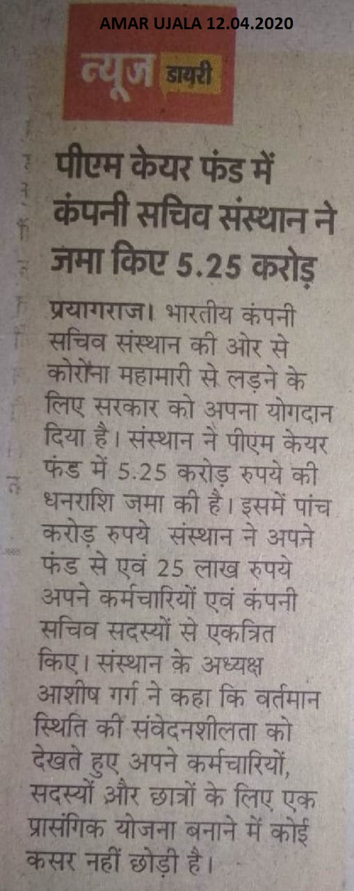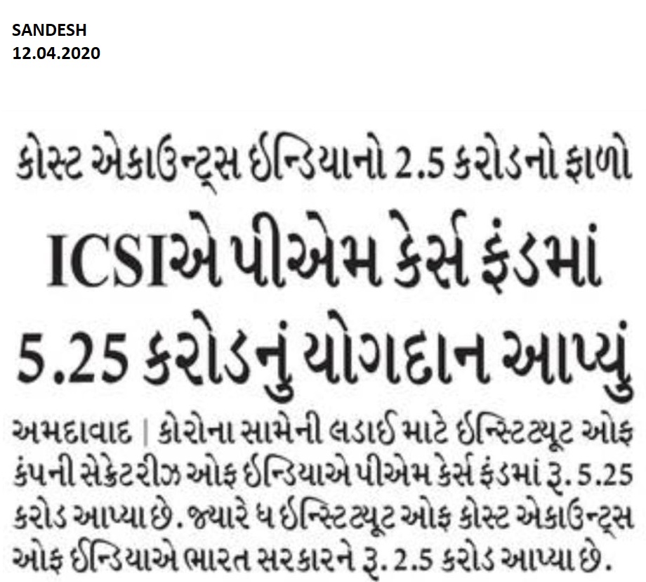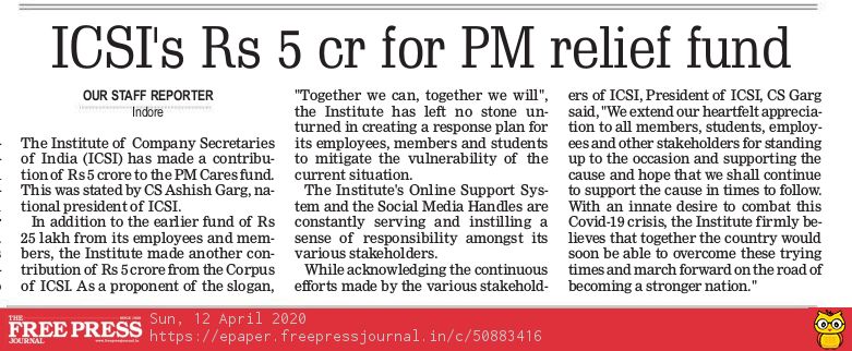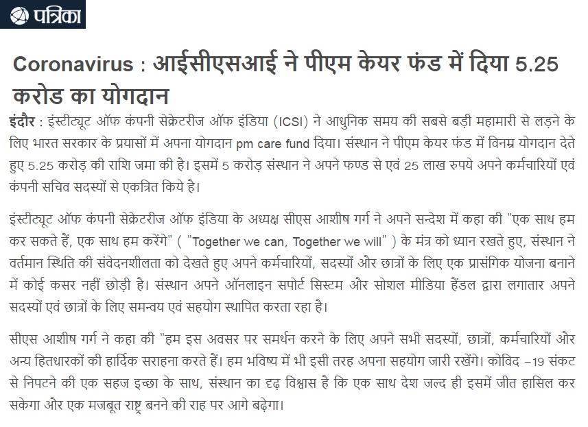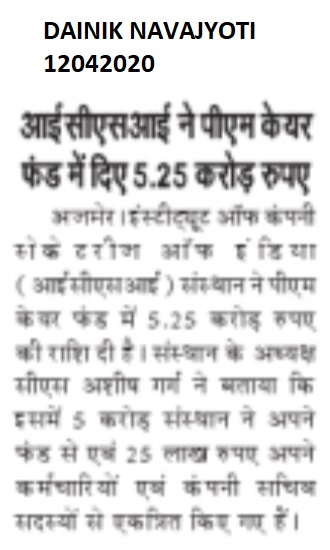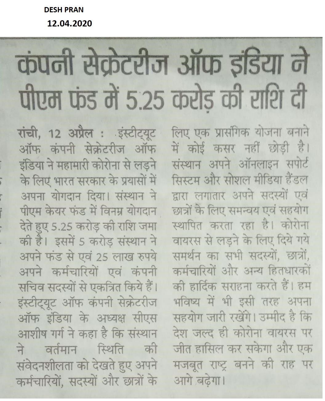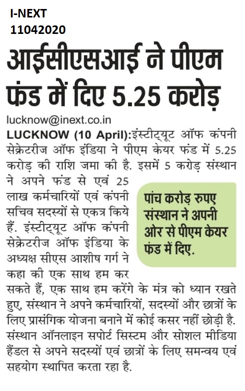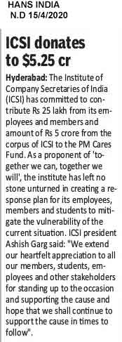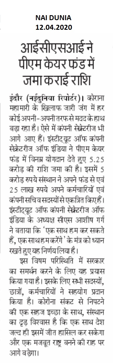 ICSI Contributes Rs.5.25 crore to PM Cares Fund