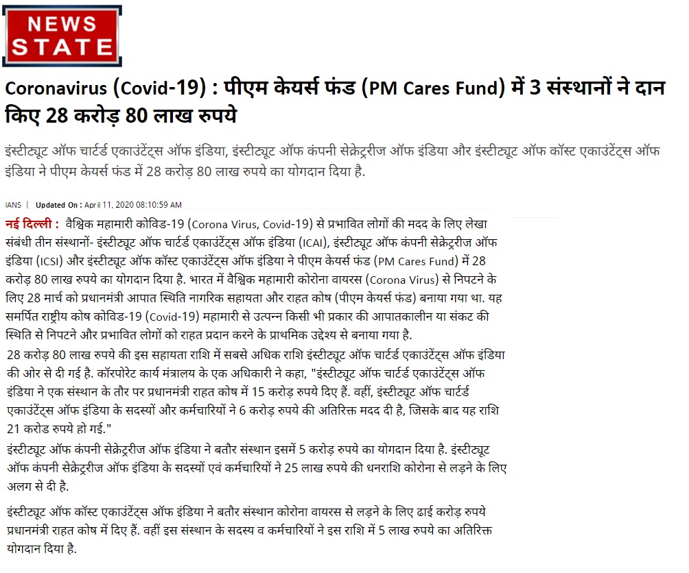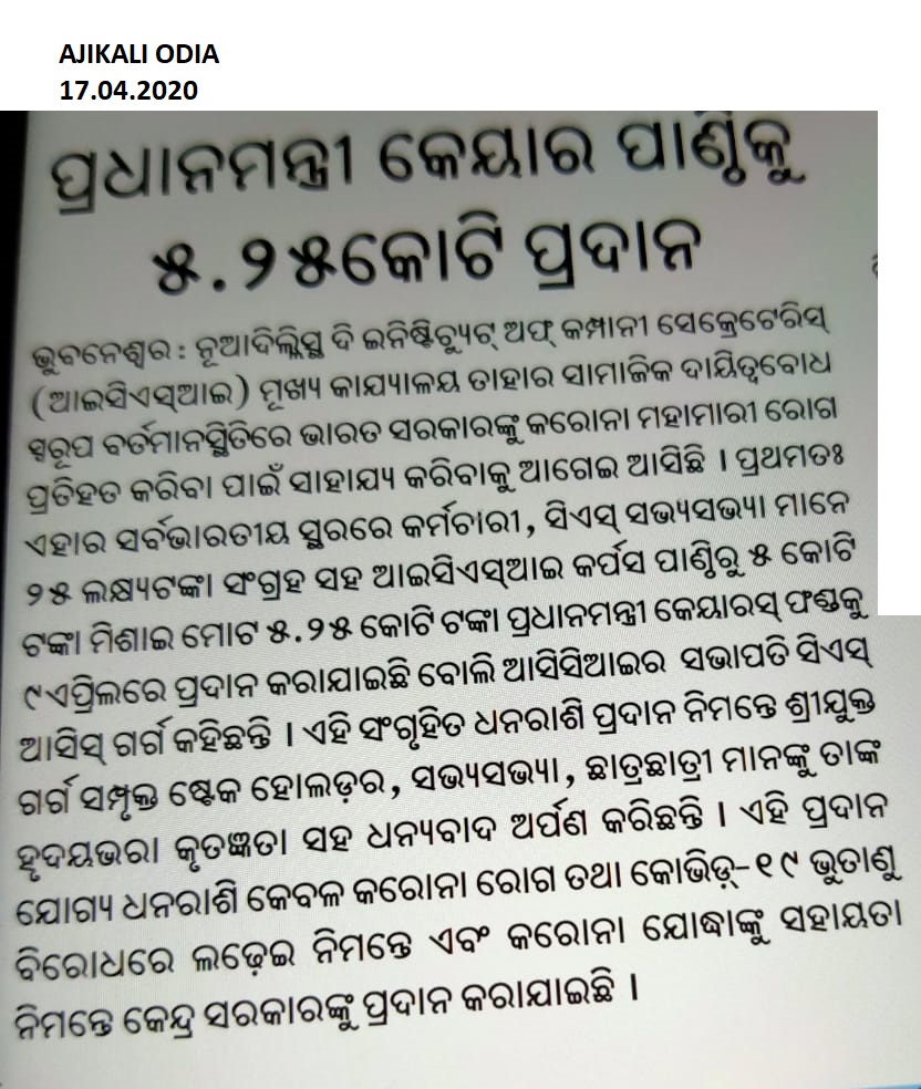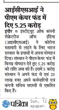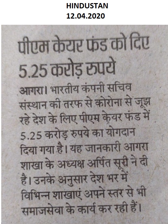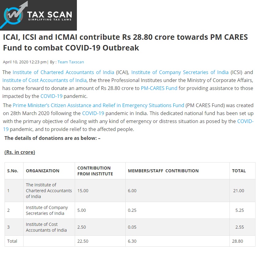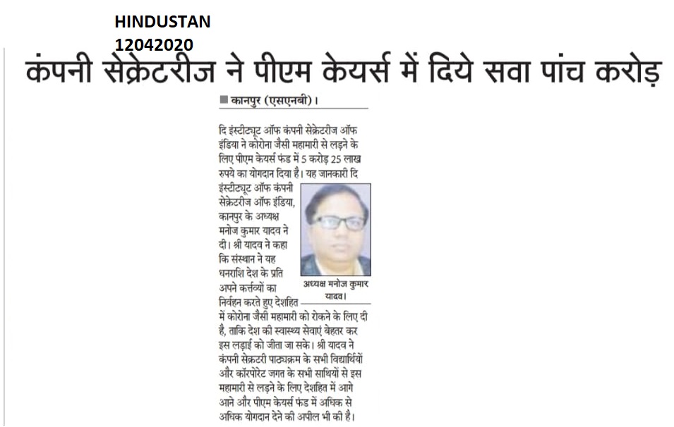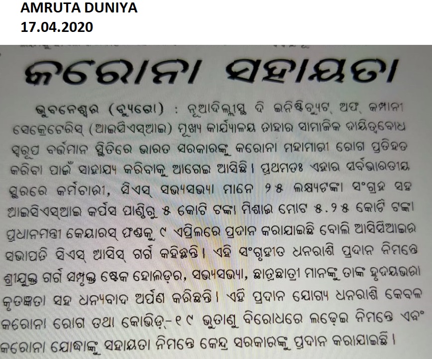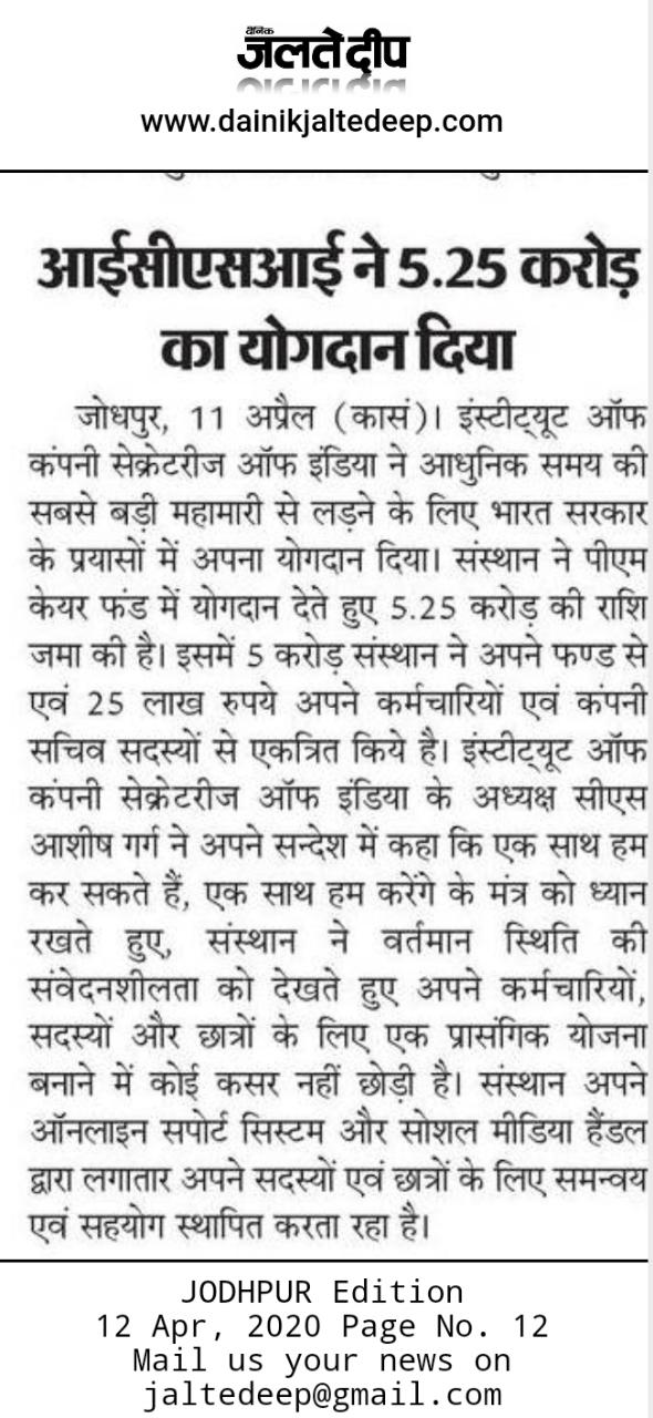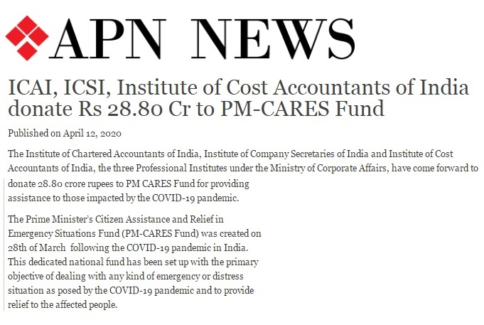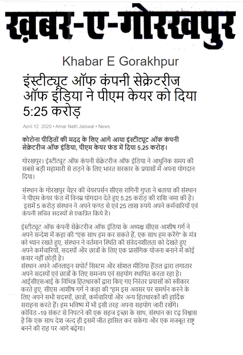 ICSI Contributes Rs.5.25 crore to PM Cares Fund