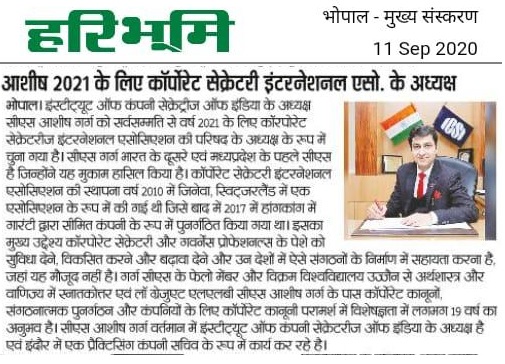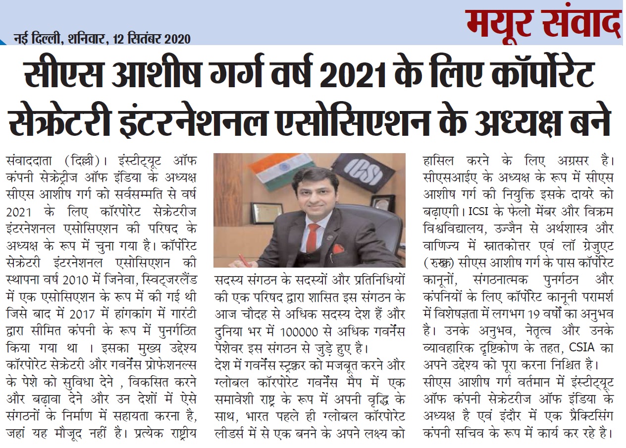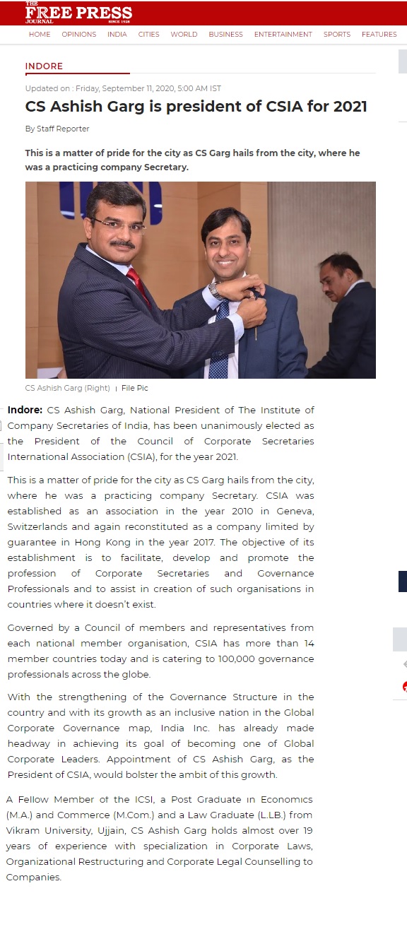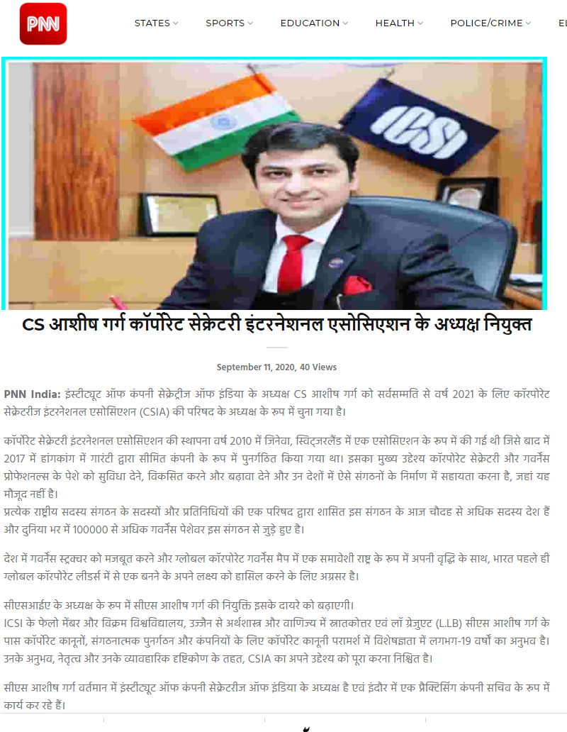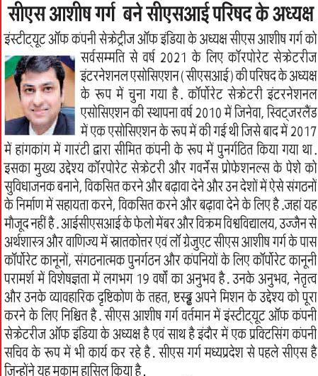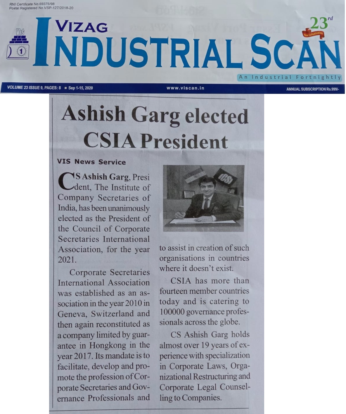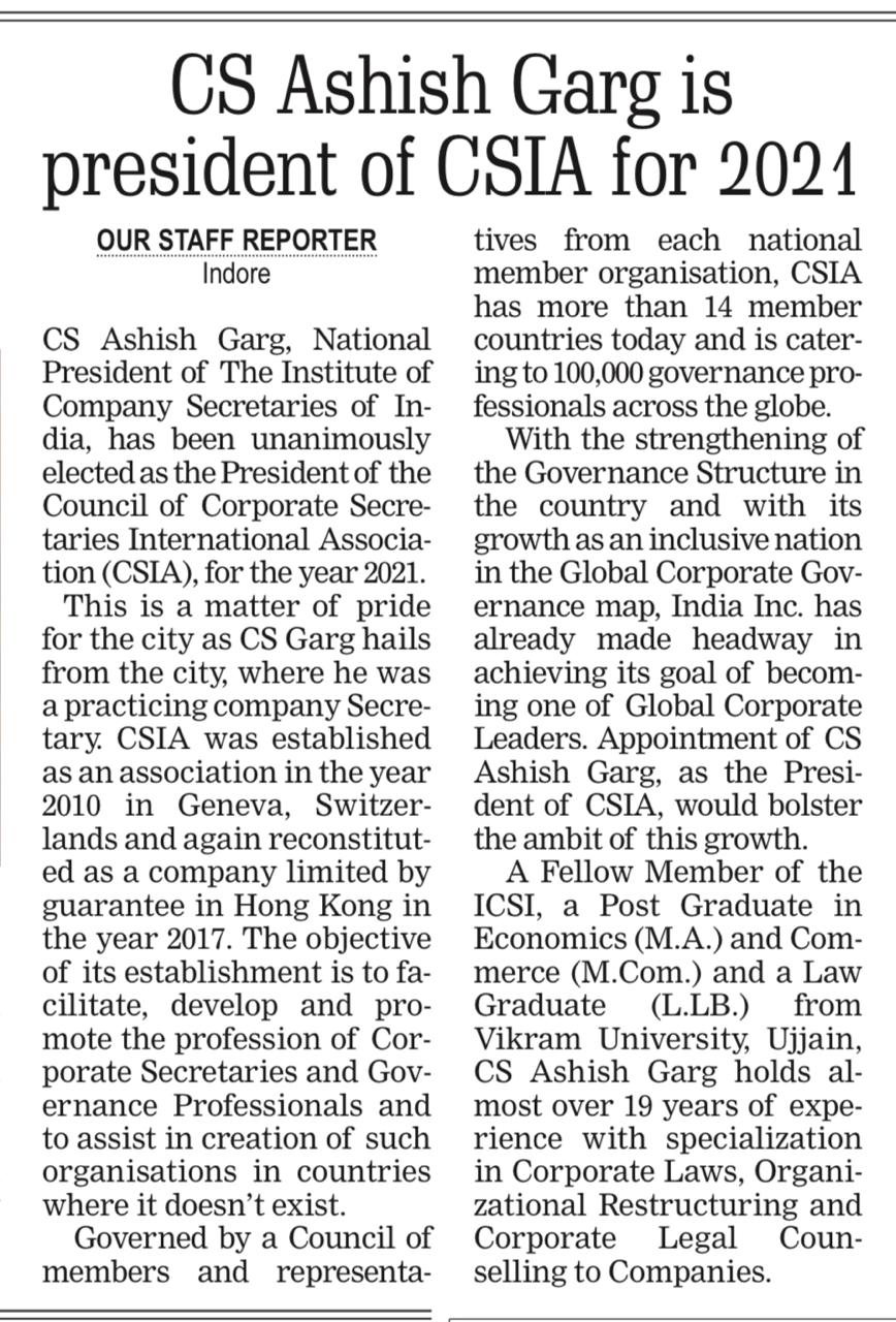 CS Ashish Garg becomes Corporate Secretaries International Association (CSIA) President for the year 2021