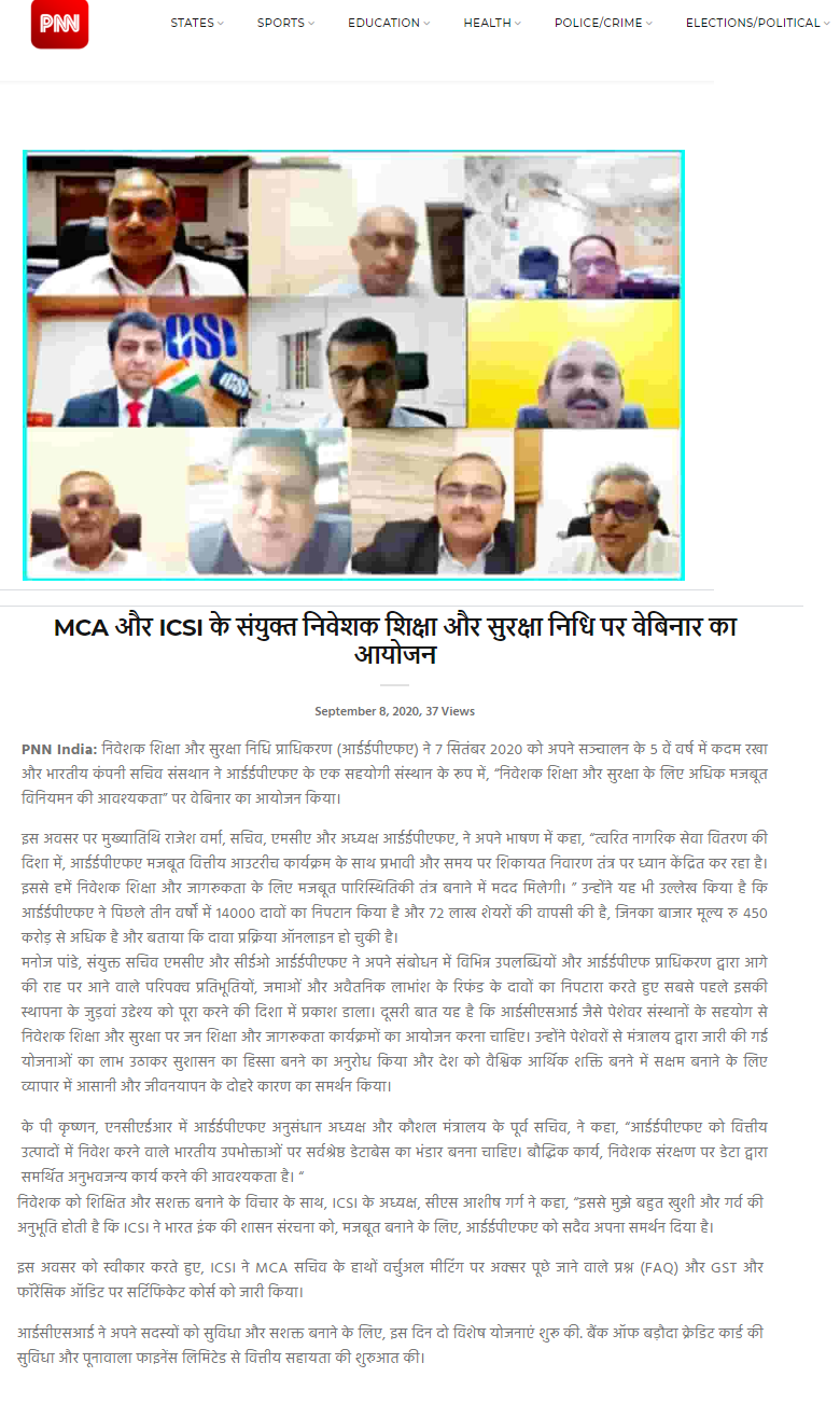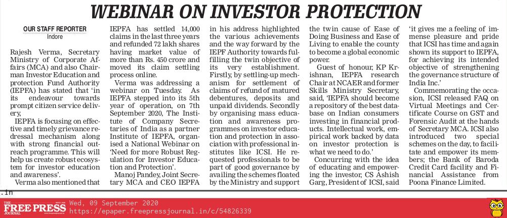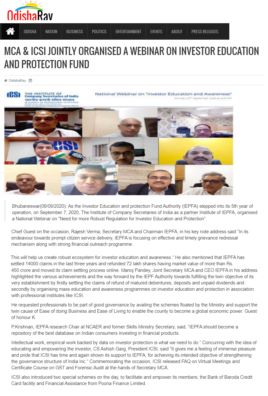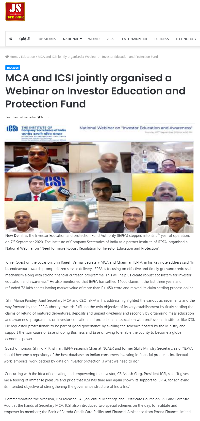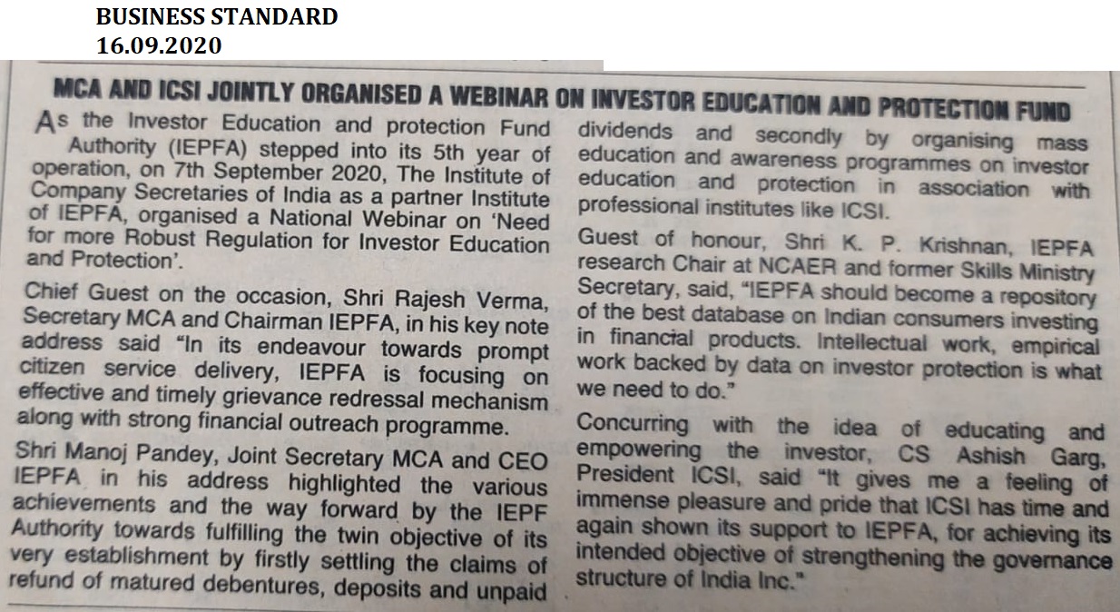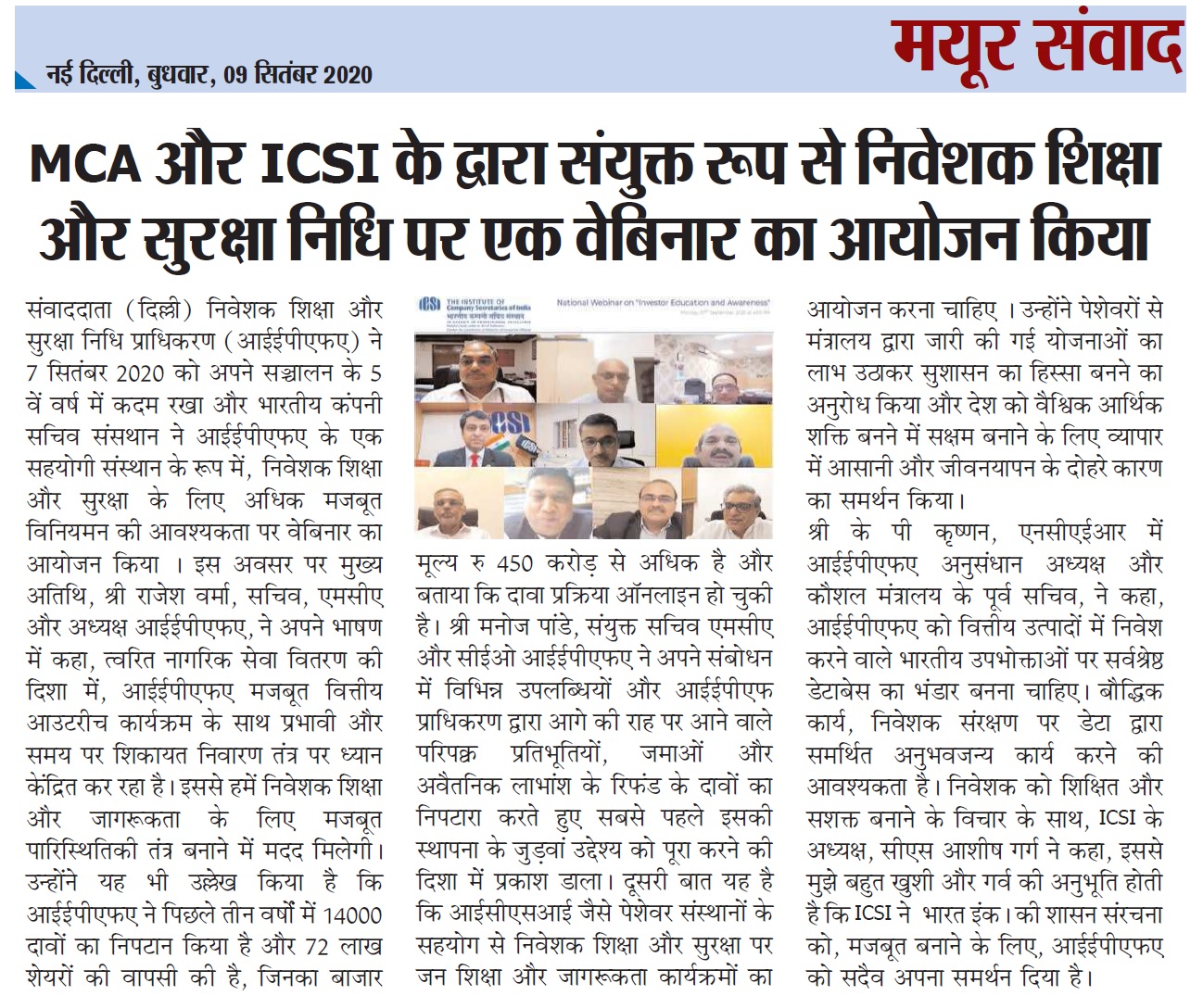 MCA and ICSI jointly organised a Webinar on Investor Education and Protection Fund