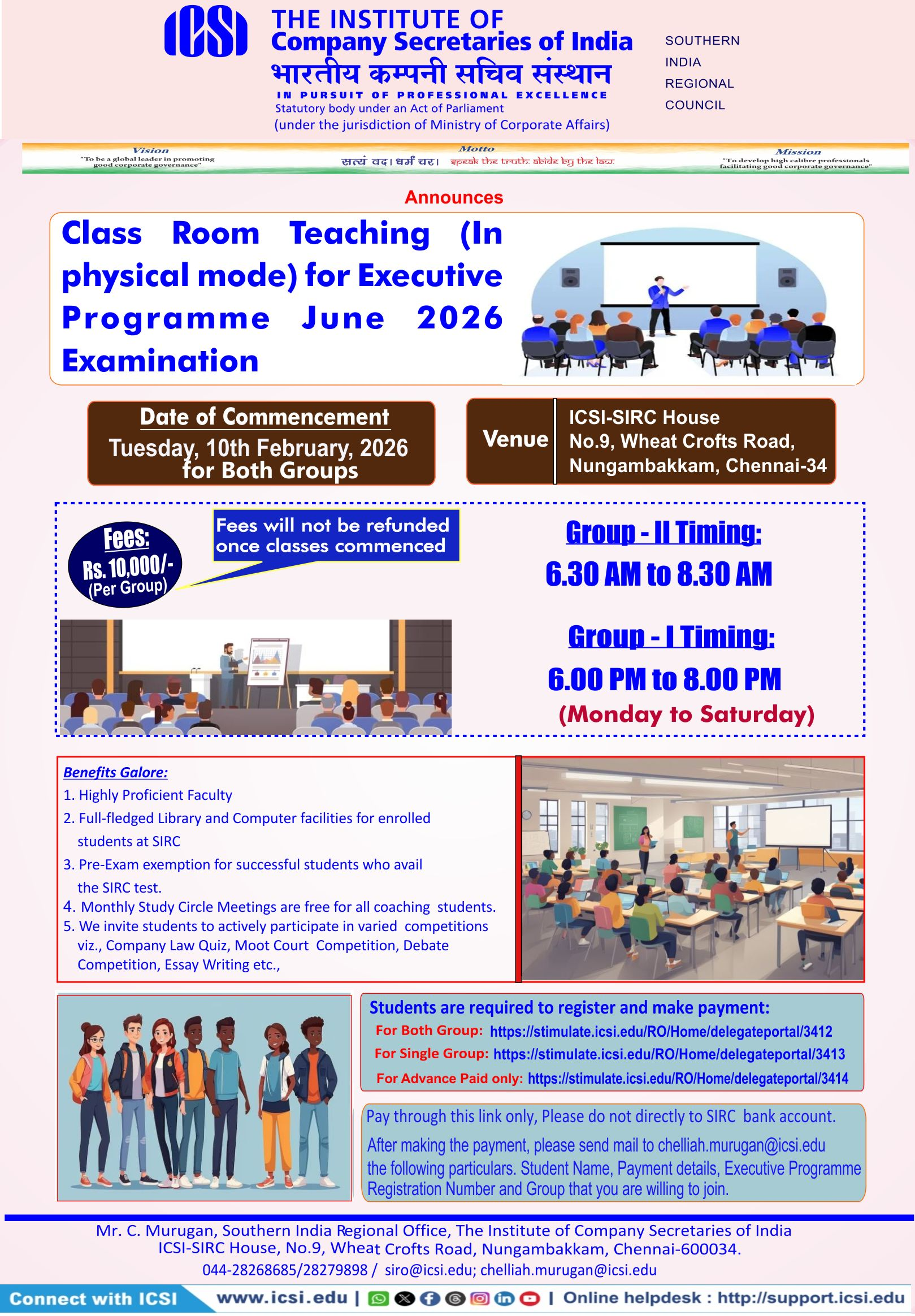 Class Room Teaching for Executive Programme june 2026 Examination from 10th February, 2026 at ICSI-SIRC House, Chennai