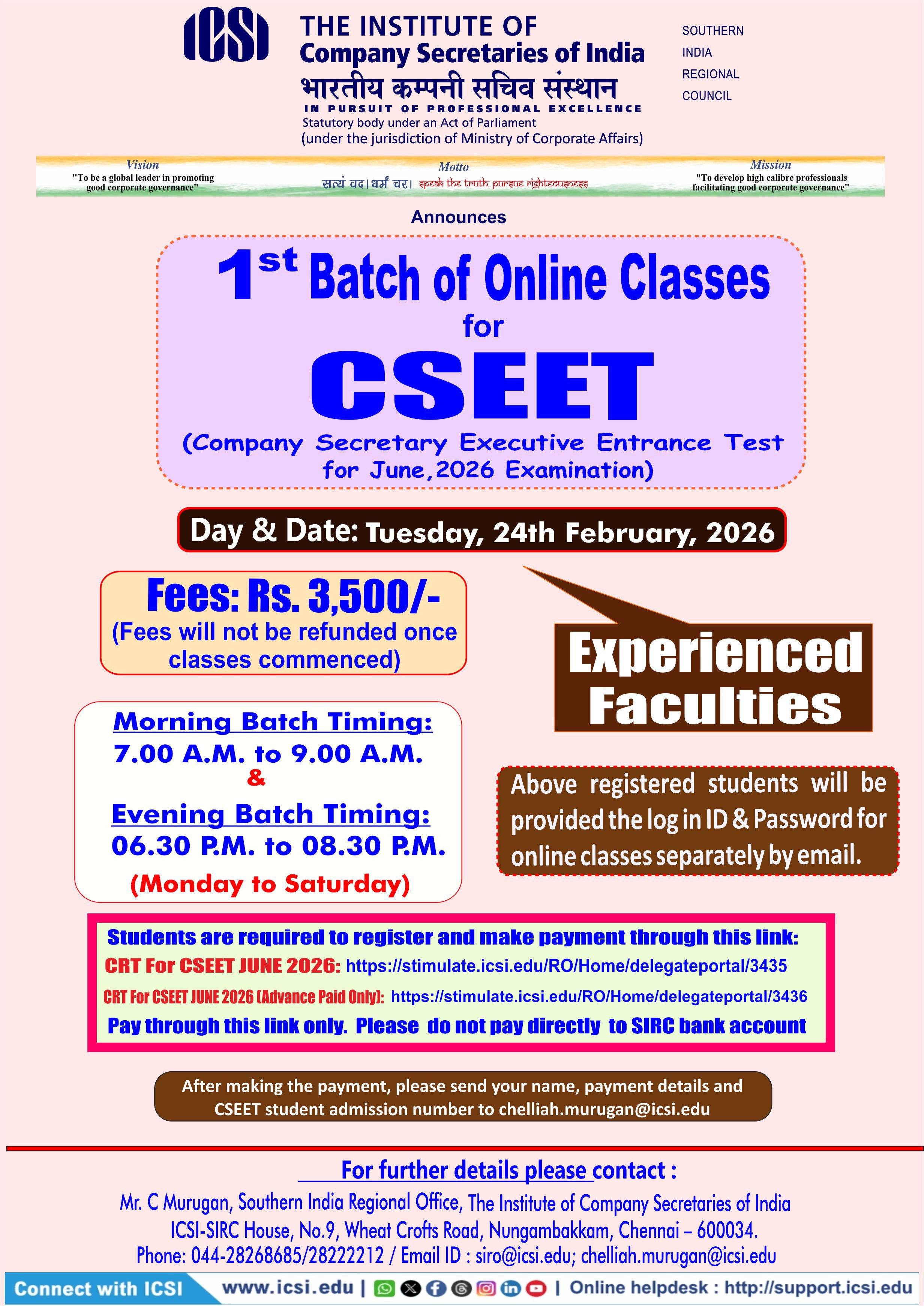 1st Batch of Online Classes for CSEET for June Examination from Tuesday, 24th February, 2026