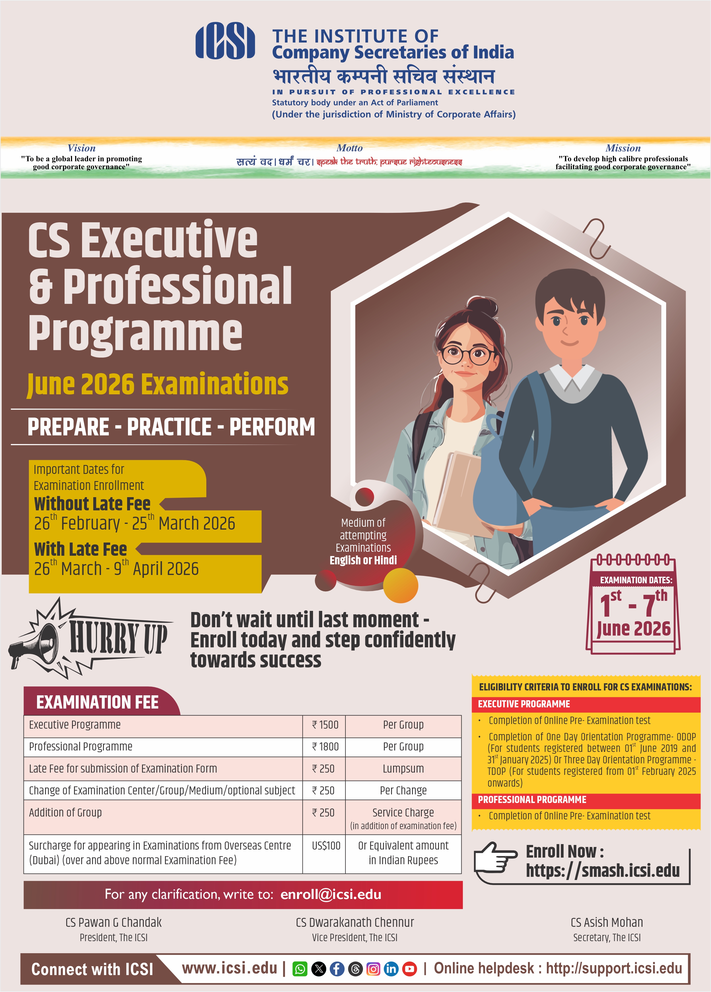 - Declaration of Result of CS Professional Programme (Syllabus 2022) and Executive Programme (Syllabus 2022) Examinations – December, 2025 Session.
